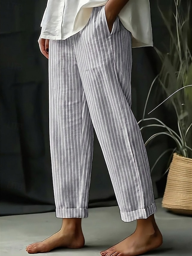 Mulheres Calças de linho de algodão Calça verão Calças de praia Clássico Casual Longas Cintura Alta Listra Bolsos Estampado Design de cordão elástico Respirabilidade Macio Micro-Elástica Férias Rua #15947789