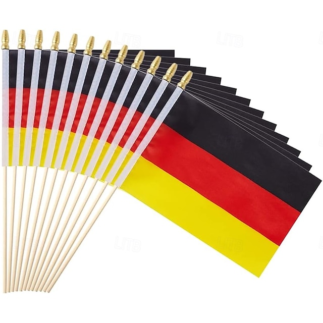 Pacote com 25 miniaturas da bandeira alemã em haste, medindo 5x8 polegadas, ideais para jogos da Copa do Mundo de Futebol, eventos esportivos, decoração de festas e para torcedores vibrarem.#16360110