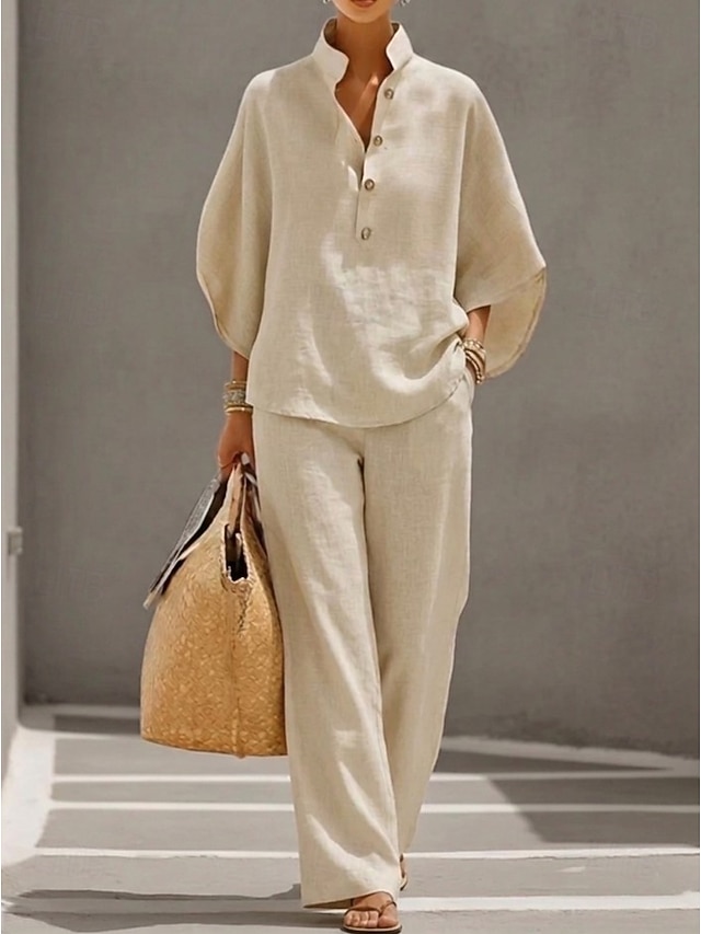 Gênero:Mulheres,Acessórios não estão incluidos:Acessórios não estão incluidos,Estilo:Angustiado,Diário,Ocasião:Casual,Diário,Tipos de Blusa:Conjuntos de linho de algodão,Decote:Colarinho Chinês,Tecido:Poliéster,Comprimento da Manga:Manga 3/4,Elasticidade:Sem Elasticidade,Cuidados:Lavar na Maquina,Estampa:Côr Sólida,Estação:Primavera,Verão,