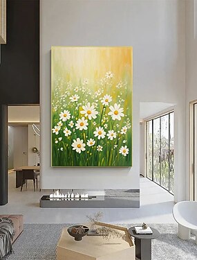Pintura a óleo feita à mão, pintura de prado de flores silvestres em tela, arte de parede texturizada com margaridas, arte floral de primavera para parede, obra de arte da natureza pintada à mão, arte