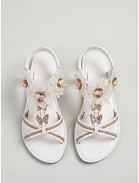 Sandálias femininas brancas românticas para praia - chinelos de dedo rasteiros e confortáveis com detalhe de flor 3D, ideais para férias de verão, casamentos na praia e resorts tropicais.