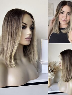 Peruca de cabelo humano brasileiro com fecho 5x5, peruca frontal de renda 13x4, corte bob curto, sem cola, lisa, loira acinzentada com mechas ombré castanhas para mulheres.