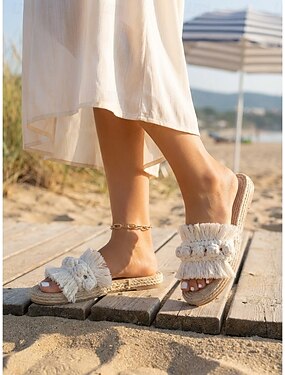 Mulheres Praia Férias Borlas Sem Salto Ponta Redonda Boêmia Férias Tecido Mocassim Preto Amarelo Verde