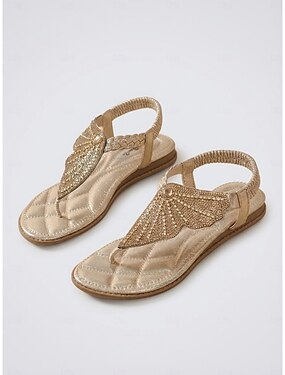 Sandálias rasteiras femininas douradas com cristais, modelo aberto na frente e com tira em T, ideais para jantares em resorts e férias. &eventos noturnos de verão
