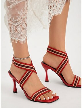 Sandálias femininas vermelhas de salto agulha em tela - modelos sensuais com bico aberto e tiras cruzadas. &Sapatos estilosos para festas noturnas com fivela ajustável no tornozelo.