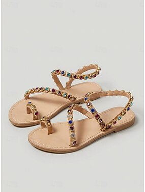 Sandálias rasteiras femininas boêmias cáqui - sandálias de dedo elegantes com tiras cravejadas de cristais coloridos, perfeitas para férias na praia, cruzeiros de verão e para usar em ilhas.