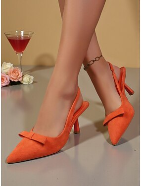 Sandálias femininas de camurça laranja com laço e salto slingback - sapatos elegantes de bico fino para festas de Ano Novo e baladas. &celebrações festivas