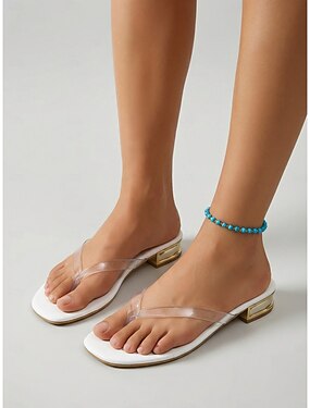 Sandálias femininas chiques de dedo - chinelos de dedo com tira transparente e salto baixo dourado metálico, perfeitas para férias em cruzeiro e glamour à beira da piscina. &roupas de verão para a