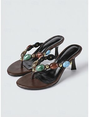 Sandálias femininas de luxo com salto marrom - modelos boêmios com detalhes em resina e pedras coloridas. &Brincos de ouro para usar em resorts à noite, jantares em ilhas. &galas de verão