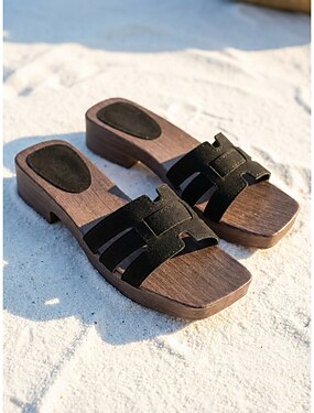 Sandálias rasteiras femininas bege com sola de madeira – calçado casual com recortes e bico aberto, ideal para férias na praia e resorts.