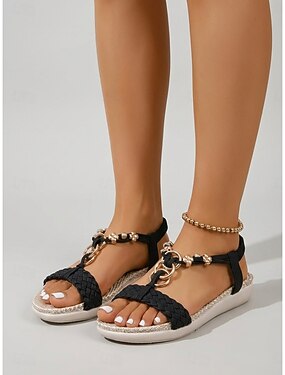 Sandálias femininas boho pretas - rasteirinhas confortáveis de corda trançada à mão com fivela ajustável, ideais para resorts ao ar livre e férias na praia. &caminhadas de verão