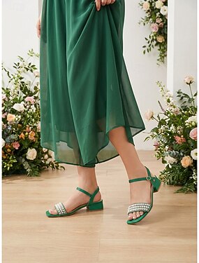 Sandálias femininas verdes de salto bloco com tira adornada com cristais, elegantes sapatos para a mãe da noiva em casamentos no jardim, sandálias confortáveis de salto baixo para cerimônias ao ar