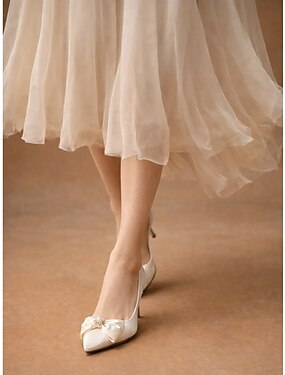 salto peep-toe slingback de cetim nude com detalhe de laço – chique e confortável, ideal para casamentos e eventos formais.