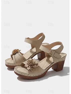 sandálias femininas de salto grosso com flores – sapatos de verão em couro sintético marrom com tira no tornozelo e design de flores 3D para caminhadas no jardim e reuniões ao ar livre