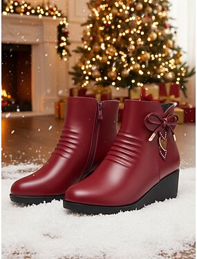 Botas femininas de couro sintético bordô com forro de pele quente e salto plataforma – botas de inverno impermeáveis e antiderrapantes com laço para dias casuais na neve, trabalho e uso ao ar livre