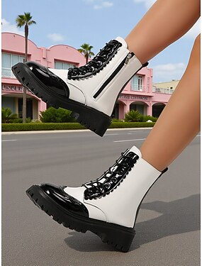 Botas de combate femininas pretas e brancas com cadarço e detalhe ondulado – estilo punk moderno, perfeitas para passeios diários, streetwear e uso cotidiano.
