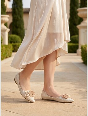 Sapatilhas femininas florais cor champanhe com acabamento texturizado, sapatos de noiva elegantes para casamento ao ar livre em jardim.