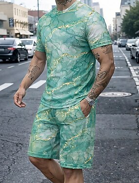Homens Mármore 2pcs Conjuntos de camisetas Tops de verão Manga Curta Calças curtas Gola Redonda Desporto Casual Na moda Ao ar livre Férias Para Noite Impressão 3D Verão Azul Roxo Verde