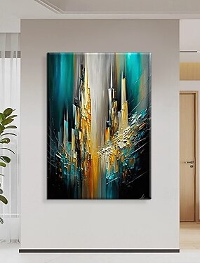Pintura a óleo feita à mão em tela, arte de parede, decoração moderna, dourada, abstrata, arquitetura urbana para sala de estar, decoração de casa, pintura enrolada, sem moldura, não esticada