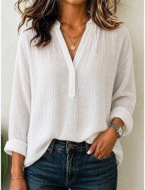Mulheres 100% Algodão Camisa casual Franzido Pullover Côr Sólida Casual Manga Longa Bispo Decote V Tops regulares Casual Branco Roxo Claro Verão Primavera