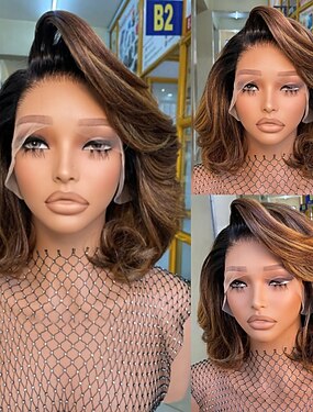 Cabelo humano remy 13x4 Lace Front Peruca Prumo Bob curto Cabelo Brasileiro Ondulado Multi Cores Peruca 130% 150% Densidade do Cabelo com o cabelo do bebê Cabelo com Luzes / Reflexos Riscas Naturais