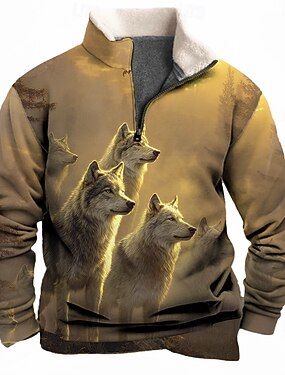 Homens Animal Lobo Tosão Moletom Moda Casual 3D Colarinho Chinês Quarter Zip Ao ar livre Férias Presente Streetwear Vinho Marron Half Zip Outono Inverno Designer S M L XL XXL XXXL