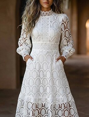 Mulheres Vestido midi Vestido Longo Vestido branco Vestido de renda Vestido casual Elegante Moda Moderno Ao ar livre Férias Para Noite Normal Delgado Geométrica Manga Longa Gola Alta Colarinho Chinês