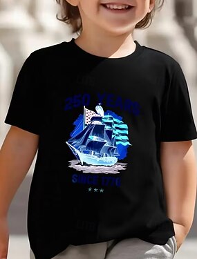 100% Algodão Infantil Para Meninos Preto Branco Barco Bandeira dos EUA 250º Aniversário Camisa Blusa Gola Redonda Manga Curta Ao ar livre Dia a Dia Moda Roupa de rua Designer Estampado Verão