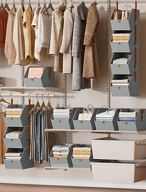 Cesto organizador de guarda-roupa suspenso de 4 níveis, destacável em 1/2 peça, com várias camadas e alta capacidade para roupas e bolsas. Compartimento dividido e dobrável, ideal para organizar seu