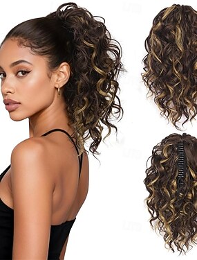 Conjunto com 2 extensões de rabo de cavalo com presilha, rabos de cavalo curtos, ondulados e cacheados, em cabelo sintético, para mulheres, 30 cm e 35 cm.