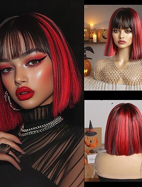 Perucas sintéticas Liso Reta natural Parte do meio Franja Lisa Peruca 12 polegadas Preto / Vermelho Cabelo Sintético 12 polegada Mulheres Macio Confortável Côr Misturada