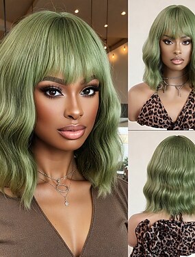 Perucas sintéticas Ondulado Curva solta Parte do meio Franja Lisa Peruca 12 polegadas Vermelho verde Cabelo Sintético 12 polegada Mulheres Macio Verde