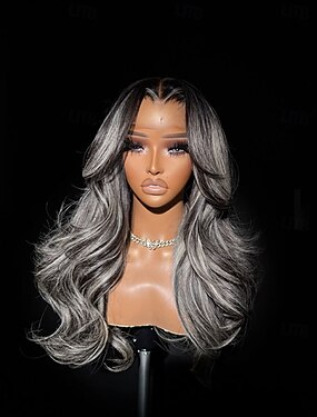 Peruca de cabelo humano virgem brasileiro 100% grisalho, sem cola, com fecho 5x5 e lace frontal 13x4, com mechas onduladas e fios de cabelo de bebê na linha natural. Ideal para mulheres.