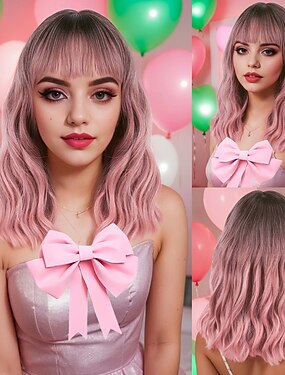 Peruca bob rosa ombré com franja, resistente ao calor, cabelo sintético ondulado para mulheres, visual natural, cosplay.