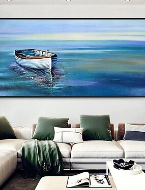 Pintura a óleo artesanal em tela, arte de parede abstrata fosforescente com superfície do mar, barco de pesca e colheita, para decoração de casa, pintura esticada em moldura ou pintura enrolada sem