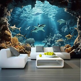 Tubarão branco, mundo subaquático 3D, vista de caverna, recife de coral, oceano azul, luz solar, tapeçaria de parede para quarto de meninos, quarto infantil, sala de jogos, decoração de casa, arte de