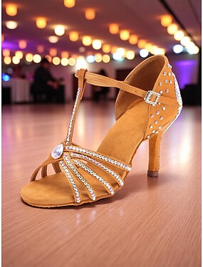 Sapatos de dança latina feminina com detalhes em strass - sapatos profissionais de salto alto para dança de salão, salsa e tango, com tira em T, ideais para apresentações e competições.