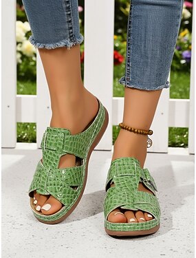 Sandálias femininas verdes com estampa de crocodilo - palmilha macia e acolchoada, design respirável com recortes, calçado estiloso e confortável para o dia a dia, ideal para caminhadas, viagens,