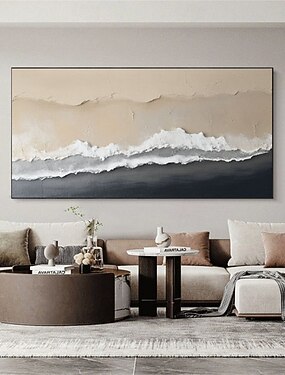 Arte de parede minimalista abstrata em preto e bege com ondas do oceano, pintura a óleo sobre tela com paisagem marinha para decoração de sala de estar costeira.