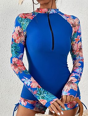 Mulheres Anti Atrito Trajes de banho de corpo inteiro Segunda-pele para Mergulho Floral Zíper Frontal UPF50+ Secagem Rápida Elasticidade Alta Manga Longa Roupa de Banho Surfe Mergulho Snorkeling Verão