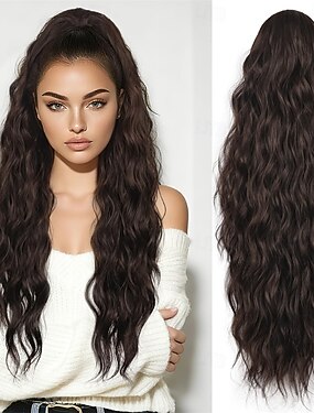Extensão de rabo de cavalo com cordão de 66 cm (26 polegadas), aplique de cabelo longo e ondulado para mulheres - aplique de cabelo sintético para uso diário (castanho chocolate com mechas loiras mel)