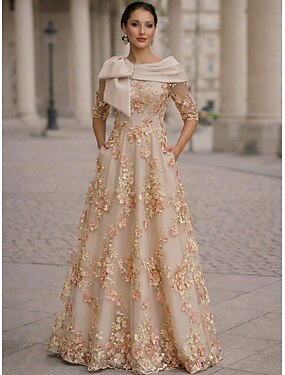 Linha A Vestidos Até o Tornozelo Vestido Coquetel Vestido de convidada de casamento Vestido Para Mãe dos Noivos Meia Manga Decote Canoa Elegante Vintage Formal Chiffon Xales com Flores 3D Laço(s)