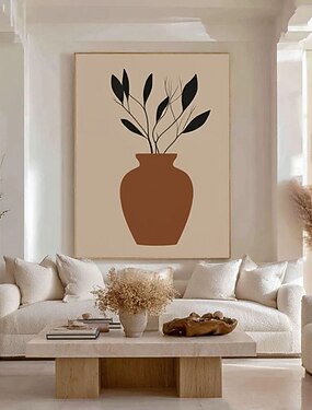 Arte de parede abstrata moderna com vaso texturizado e planta, vetor minimalista, pintura desenhada à mão em estilo boho, design profissional de meados do século.