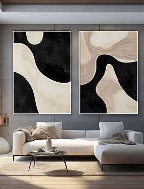 Conjunto de 2 pinturas abstratas feitas à mão em óleo, em preto e branco, para decoração de parede. Arte moderna e contemporânea para parede.