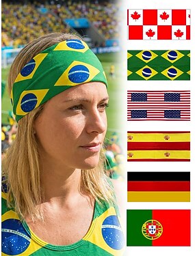 Faixa de cabelo feminina elástica em poliéster estampado com bandeiras de vários países, ideal para torcer por fãs de futebol em dias de jogos, no estádio, para uso casual em esportes e no dia a dia.