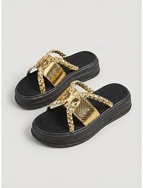 Sandálias plataforma femininas com corrente dourada – sandálias rasteiras robustas para usar na praia e nas férias de verão.