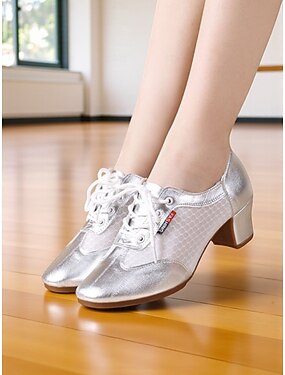 Sapatos de dança brancos com cadarço para mulheres - calçados de salão de salto grosso e brilhante com design de malha respirável para prática e performance