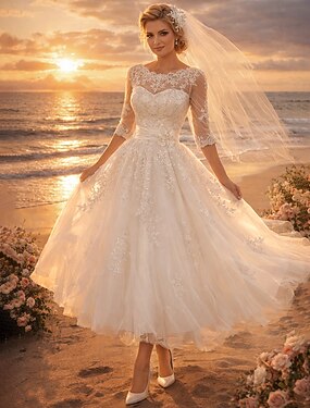 Linha A Longuette Vestidos de noiva Vestidos para Chá de Panela Vestido de Noiva Vintage anos 1940/1950 Vestidos Brancos Justos Manga 3/4 Ilusão Decote Graduação Aniversário Renda Tule com Apliques