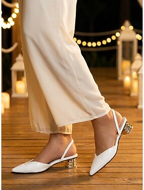 Sapatos de salto baixo brancos com tira no calcanhar e detalhe metálico no salto, elegantes para a mãe da noiva em casamentos na cidade, sapatos de bico fino para eventos noturnos. &eventos formais