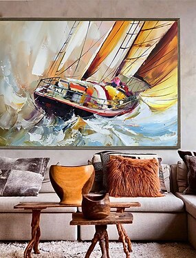 Pintura a óleo pintada à mão arte de parede abstrata barcos pintura em lona decoração de casa decoração moldura esticada pronta para pendurar